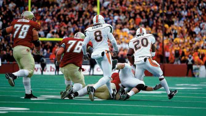 After an interception, Ed Reed strips the ball from his teammate and takes it for a touchdown to seal Miami’s win vs. Boston College during the 2001 season.