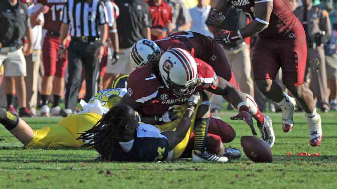 Michigan had possession after a controversial first-down call on a fake punt, and gave the ball to Vincent Smith, its 5-foot-6, 175-pound running back. Clowney rumbled through Michigan’s line untouched and met Smith, who was just receiving the ball. Smith’s helmet and the ball went flying, and Clowney recovered. “It sounded like a car wreck,” South Carolina defensive tackle J.T. Surratt said. South Carolina won 33-28, and Clowney earned an ESPY for the hit. — Rittenberg