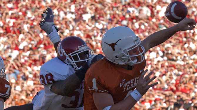 On Oct. 6, 2001, Roy Williams flies through the air and hits Texas QB Chris Simms, forcing an INT to Teddy Lehman to secure the Sooners’ win.